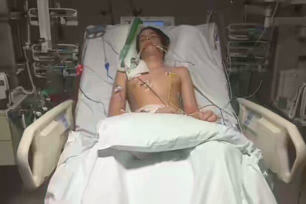 Harrowing photographs show him lying on a hospital bed covered in tubes and wires after surgeons desperately battled to save his life.